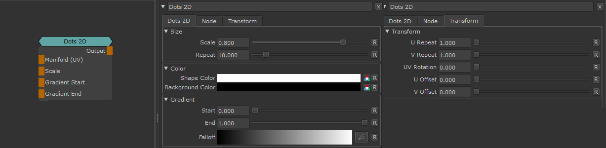 Dots 2D creates circular patterns. Pattern generation is done based on UV Space so there will be seams between tiles and uv shells.