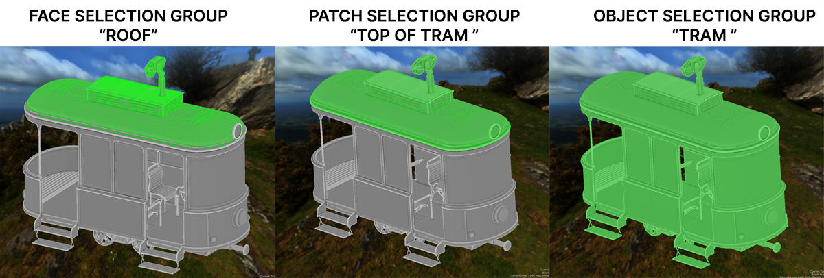 Below we have an example where the roof of the Tram Object is part of three different selection group types