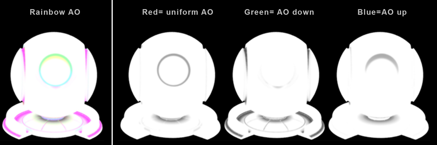 The Rainbow AO Preset will create a RGB Ambient Occlusion with different Ambient Occlusion Calculations per Color Channel