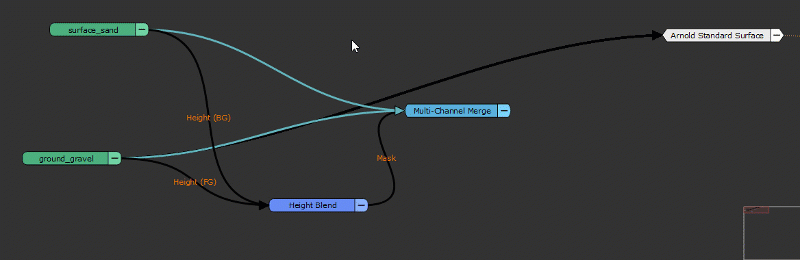 Below you can see an example of two different material nodes (green) combined via a multi-channel merge node (light blue).