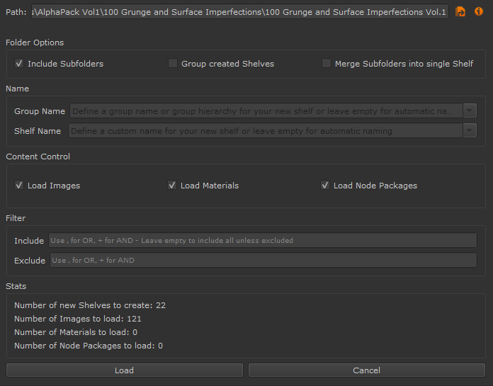 If checked, the contents of Subfolders of the supplied Path will be placed into a single Shelf with the Name of the Base Folder.