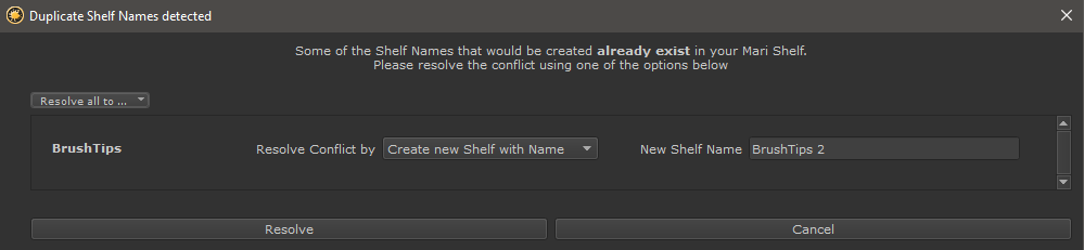 If the Shelf from Folder Dialog detects an existing Name you will be prompted to resolve the conflict.