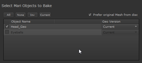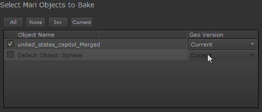 By default the currently active Mari Geo Version will be baked. Using the Geo Version Dropdown you can choose to bake all Geo Versions or only specific ones.