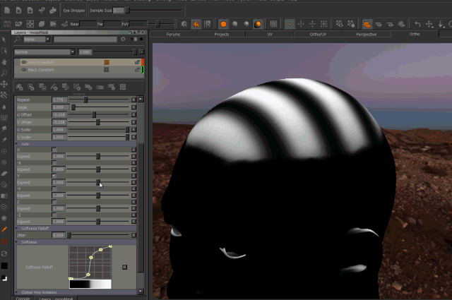 The Softness Falloff Curve determines the general Falloff of each projection axis to its sides.