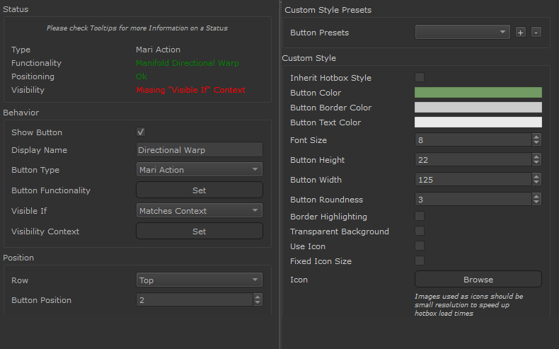The Custom Style Group offers options to overwrite the style of a specific button so it is different than the style defined in the Hotbox Settings