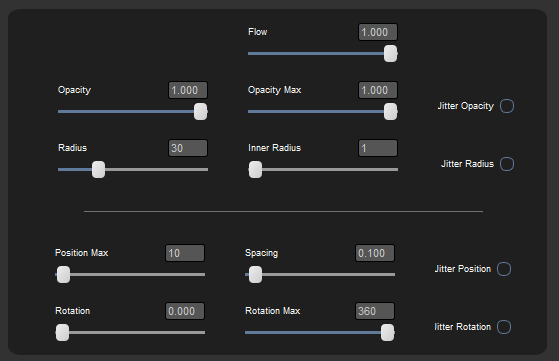 Brush Settings Hotbox Edit the most commonly used Brush settings right within a Hotbox. The Hotbox is context sensitive and will show additional options, if the Paint Through Tool is active. Hotkey