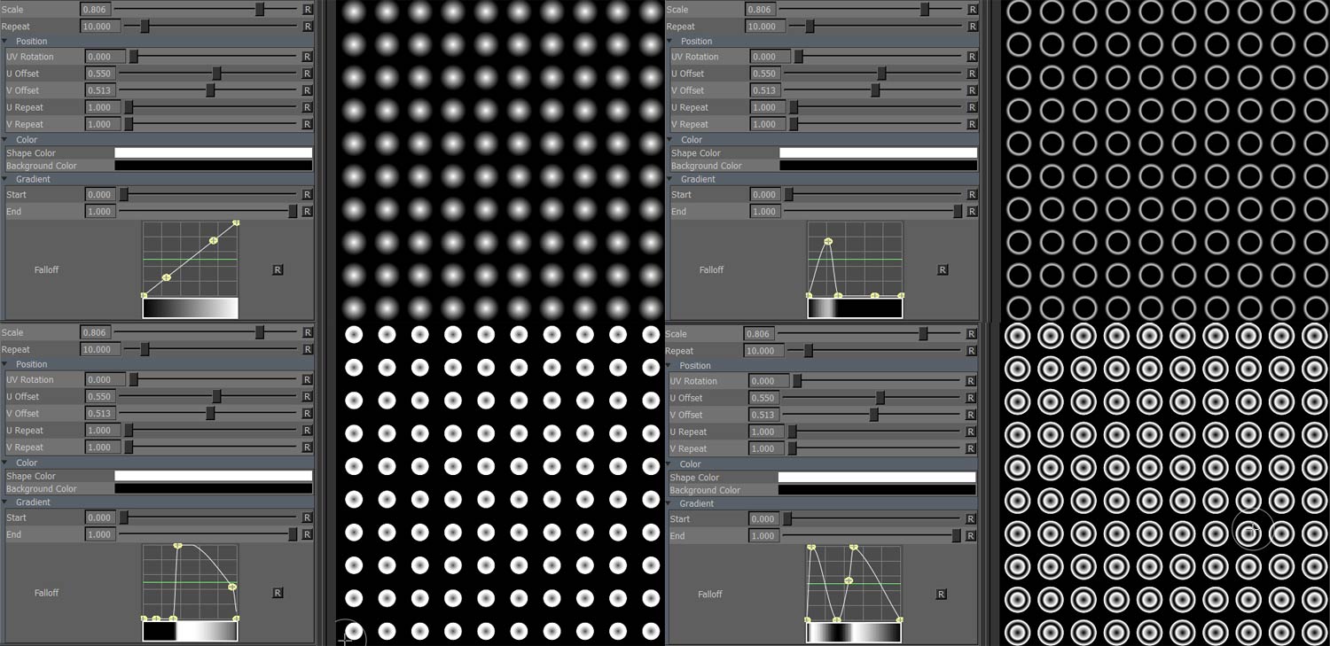 Dots 2D creates circular patterns. Pattern generation is done based on UV Space so there will be seams between tiles and uv shells.