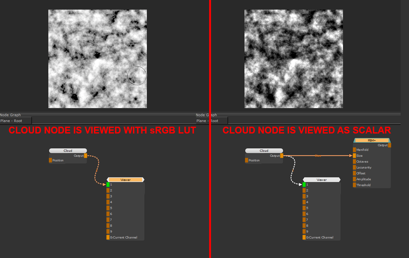 For example viewing a cloud node attached to the mask of another node will display the cloud node as scalar.