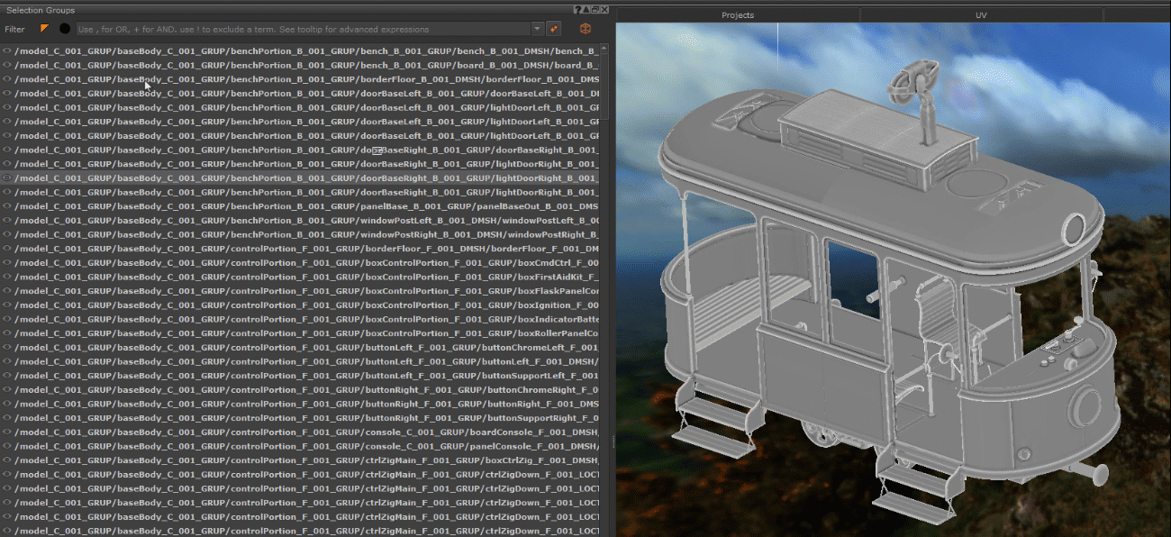 Below we have an example where the roof of the Tram Object is part of three different selection group types