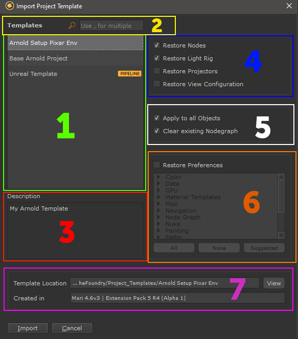 •On top of project specific data such as Nodes, Lights etc., Templates also save a Snapshot of your Mari Preferences found in the Edit Menu.