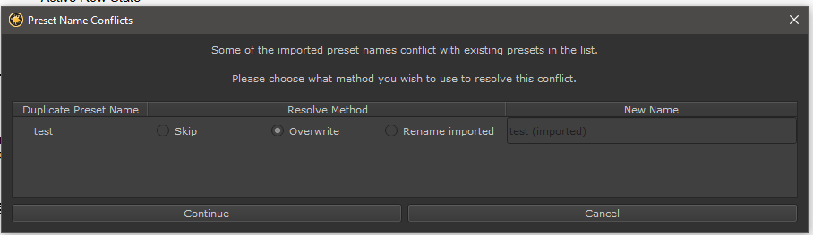 Import Presets from a configuration file. If presets with same names already exists, a dialog will prompt you for conflict