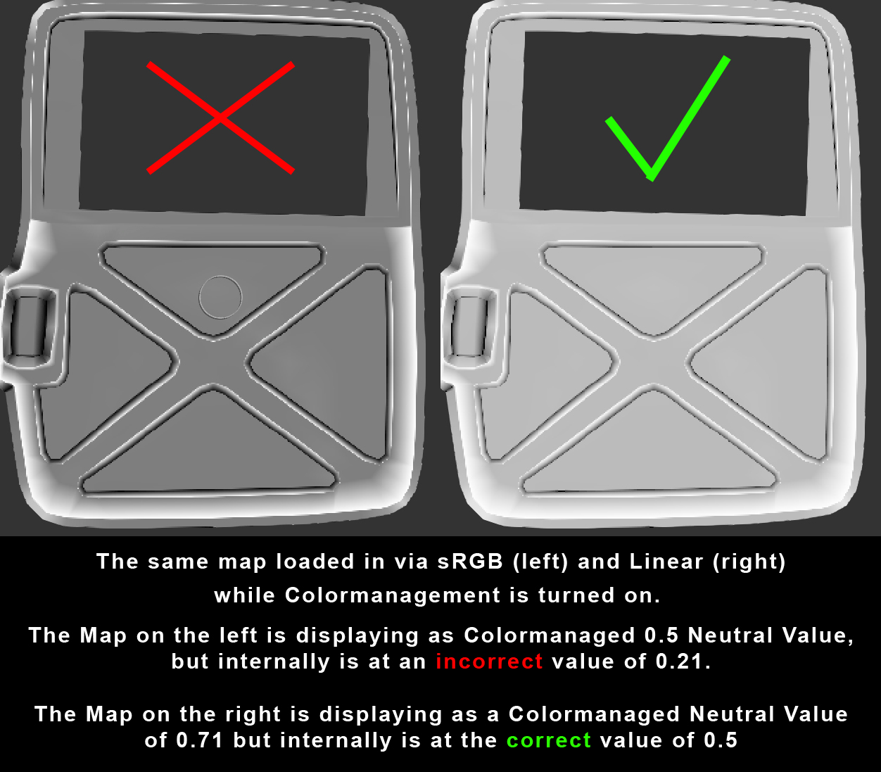 LINEAR DATA Curvature Maps should always be evaluated in 'Linear' Colorspace. When loading in a Map into Mari set the Colorspace field in the File Loader to 'Linear'. This is very important since many processes such as Contrasting,Blendmodes etc. use a default midpoint of 0.5 linear.When loading in a curvature map as sRGB its colormanaged mitpoint is 0.5, however the internal data is converted to a value of 0.21. If you incorrectly loaded a curvature map as sRGB add a 'sRGB to Linear' Adjustment with the 'Invert' Option ticked or apply it directly via Menu Filters/sRGB to Linear