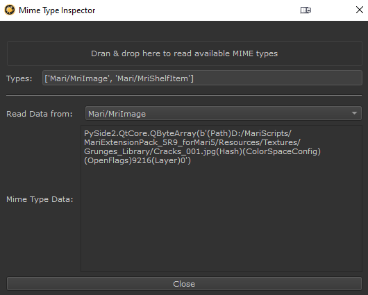 FeaturesToolsPython Mime Type Inspector Where to find them: Main Window / Extension Pack / Python / Main Window / Python / The Mime Type Inspector allows you to check the MIME Data being transmitted by a Drag and Drop event.