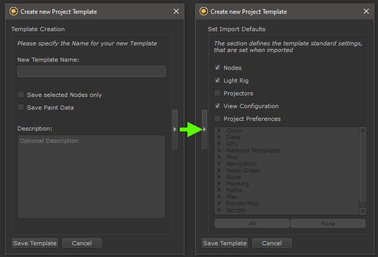 The Save Template Dialog is split into two sections (Template Creation & Import Defaults), which you can navigate inbetween by clicking the vertical splitter button