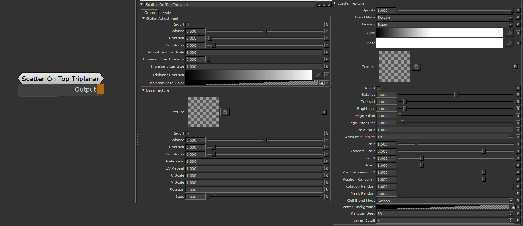 The Scatter Texture Group controls the settings of the Foreground Texture Bombing of the Node
