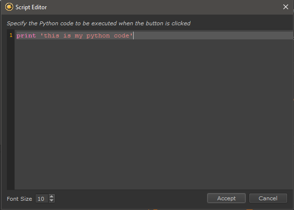 If your Button Type specifies the type 'Python Code' clicking the Button Functionality Button launches a dialog to insert your python code.