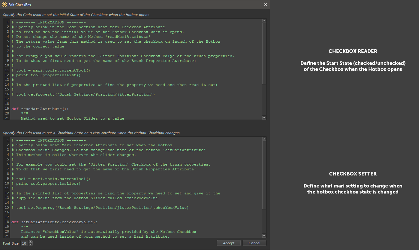 The Checkbox Reader Code Section reads a Mari Attribute and sets the Hotbox Checkbox to an appropriate value (checked/not checked) when the Hotbox is launched.