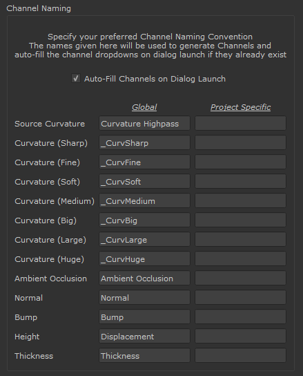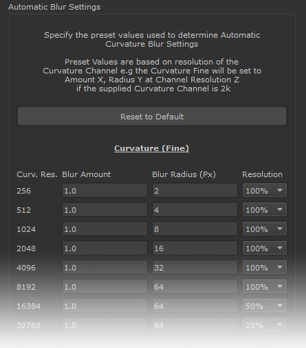 The Automatic Blur SettingsI Section holds the default Blur Settings for generating Curvature Variation Maps (Curvature Fine, Soft, Big etc.).