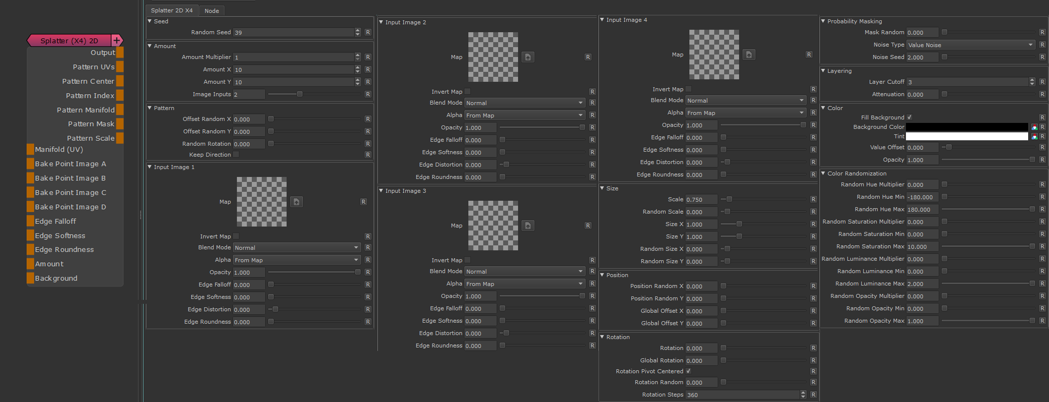 Designed for creating random patterns, Splatter nodes allow Texture Bombing with up to 4 Texture Inputs