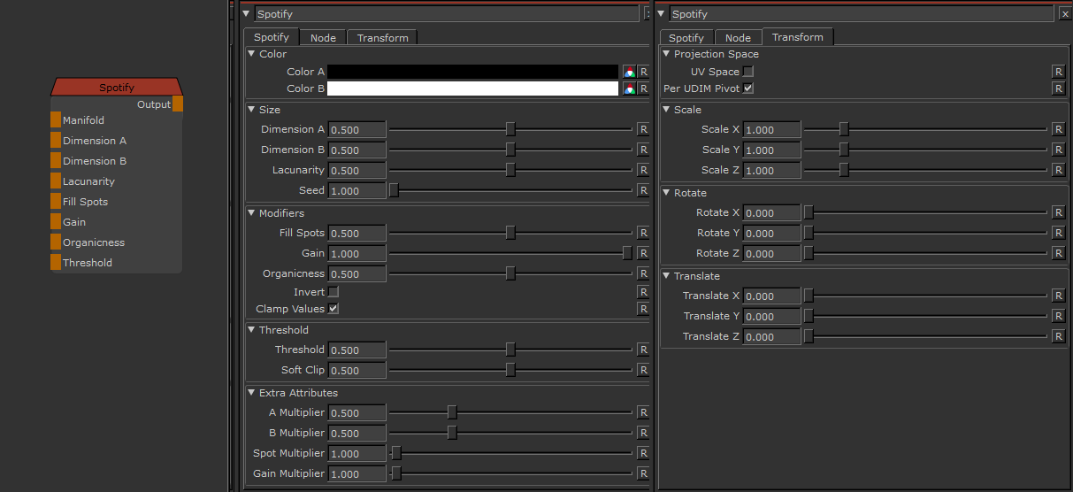 Spotify is made up out of 2 different noises. DimensionB controls the frequency of the secondary noise
