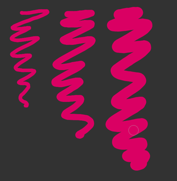 Example of similar strokes with different Pen Pressure Curves, here we are looking at the effect of