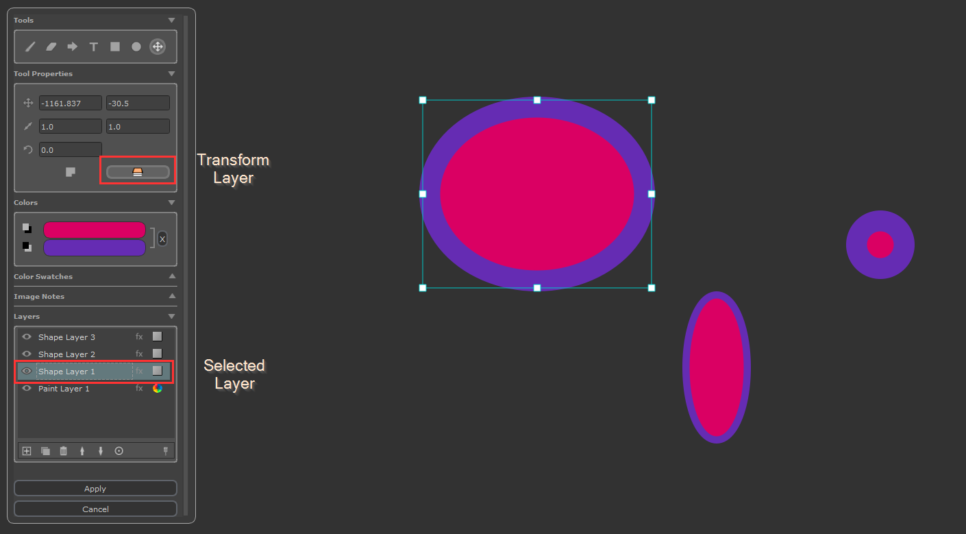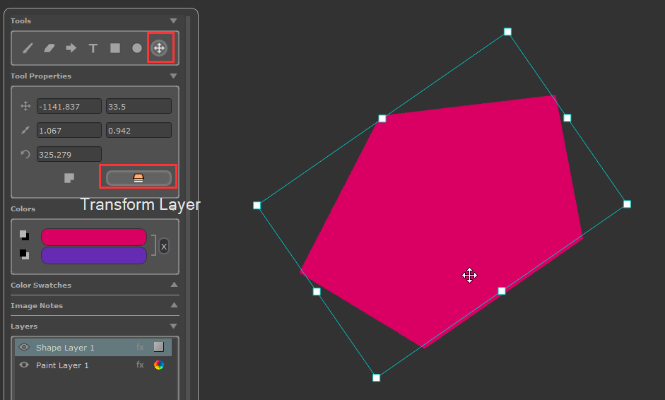 To Transform the contents of a layer, set the Transform Mode to "Layer"