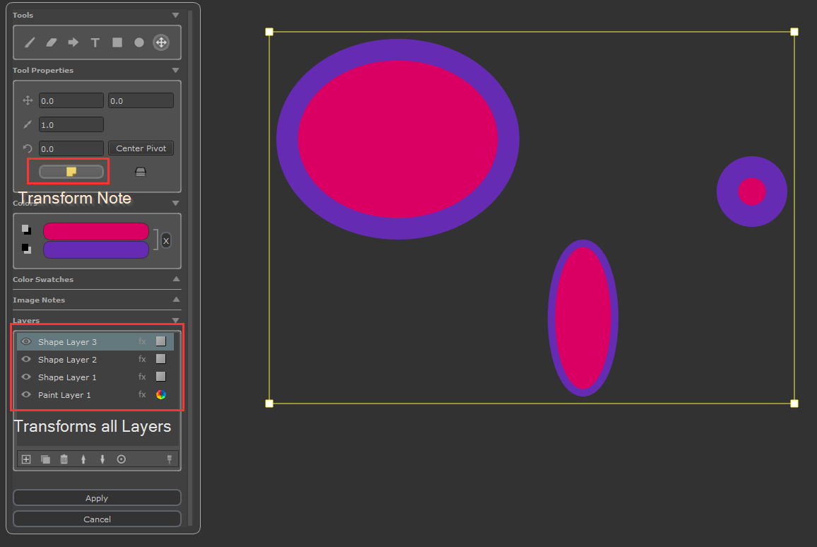 While Vector Tools directly create their shapes on the active Layer, Paint Tools first draw on an invisible plane hovering over the canvas - called the "Paint Buffer".