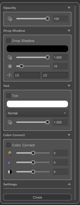 Each Layer can have Effects such as Drop Shadows applied via its own FX Stack. To open the FX Stack click on the "FX" icon in the Layerstack![]()