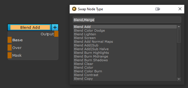 If the selected Node is a Blend Mode Node, Swap Node Type will open pre-filtered to show other Blend Mode Nodes and Merge Nodes