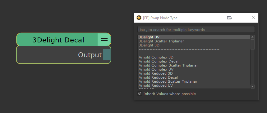 Swap Node Type allows the swapping of one Node Type for another e.g. a 'Tiled' Node for a 'Triplanar',