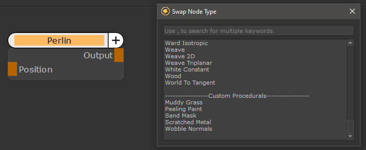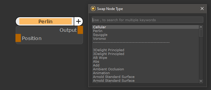 Example of swapping from a Perlin Node, with the nodes from the same category (Cellular, Perlin, Squiggle etc.) displayed at the top of the list