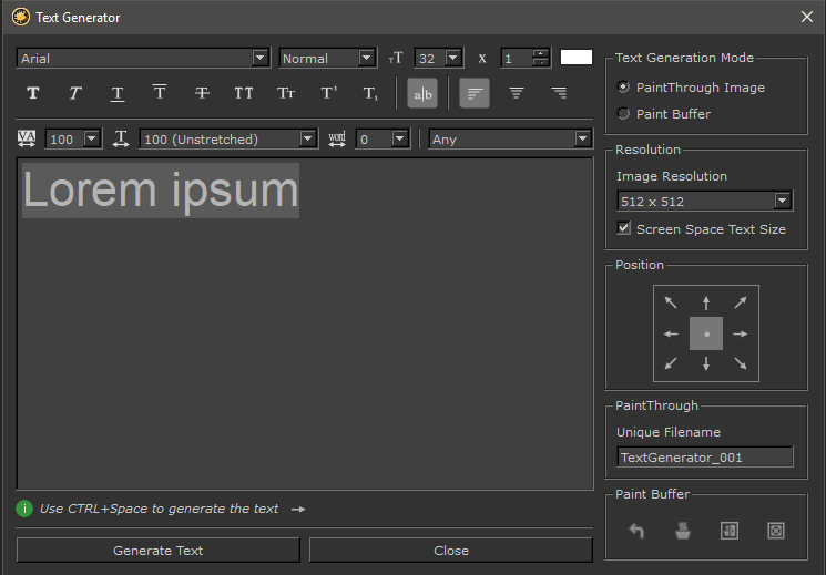 Before you start to generate Text, you need to decide if you want the text created directly in the Paint Buffer or as a Paint Through Image.