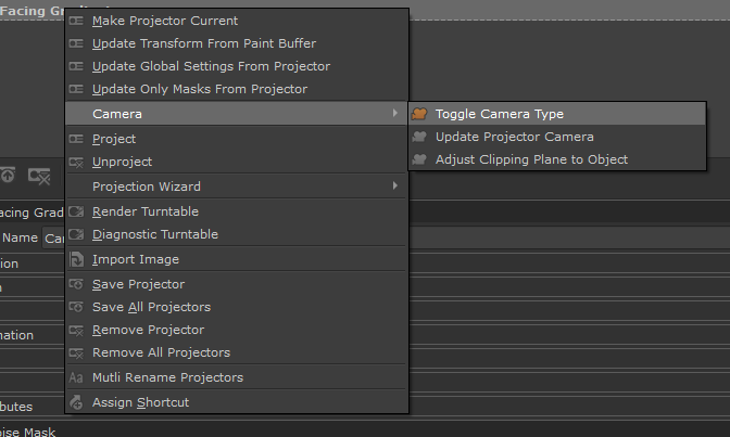 Toggle Camera Type will toggle the currently selected Projector between an Orthographic Camera and a Perspective Camera