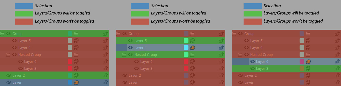 Will switch the visibility of selected layers/groups to their opposite state - visible layers will become hidden,