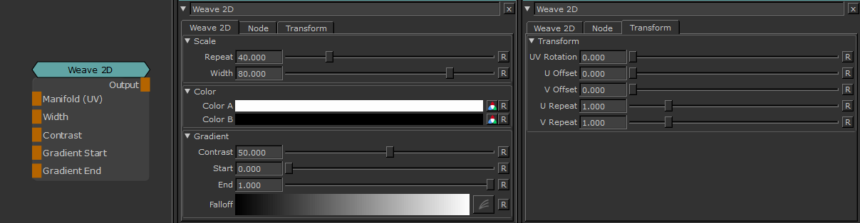 Weave 2D is similar to Maya's 'Weave' texture, creating a fabric pattern.